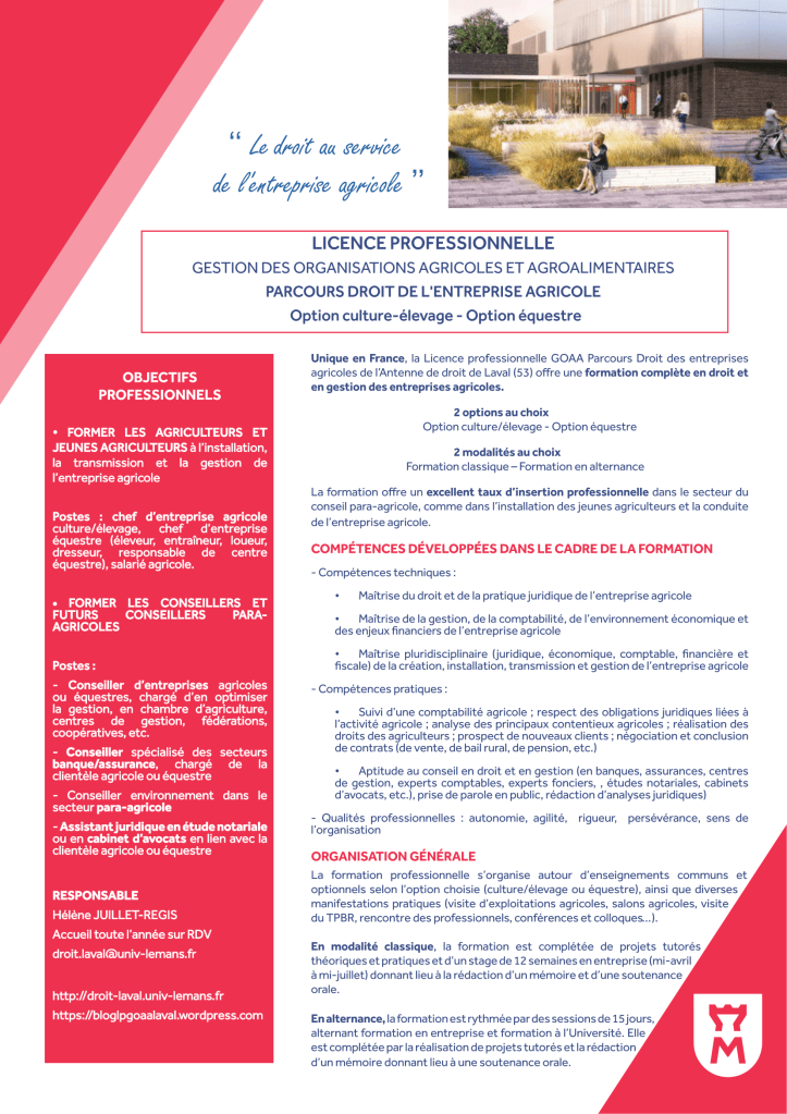 La Licence Professionnelle Gestion des Organisations Agricoles et Agroalimentaires – Parcours Droit de l’Entreprise Agricole de Laval (LP GOAA DEA) est une formation unique en France par son contenu.