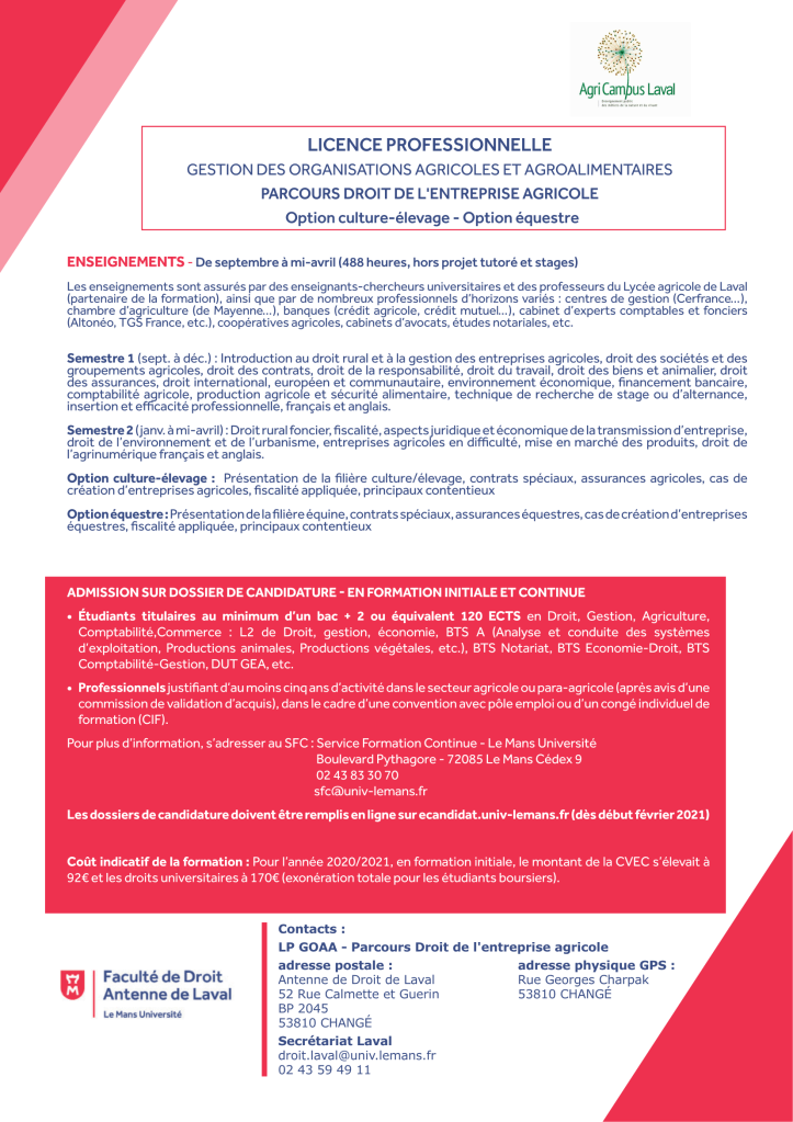 Portée par la Faculté de Droit-Campus de Laval, en lien avec l’Agricampus de Laval, elle offre une double formation en droit et en gestion des entreprises agricoles. Elle forme ainsi les étudiants à la gestion juridique, économique et comptable de l’entreprise agricole et/ou équestre ainsi qu’aux enjeux juridiques et pratiques que soulèvent l’installation, la gestion, la transmission de l’entreprise agricole et les activités agri-environnementales connexes.
