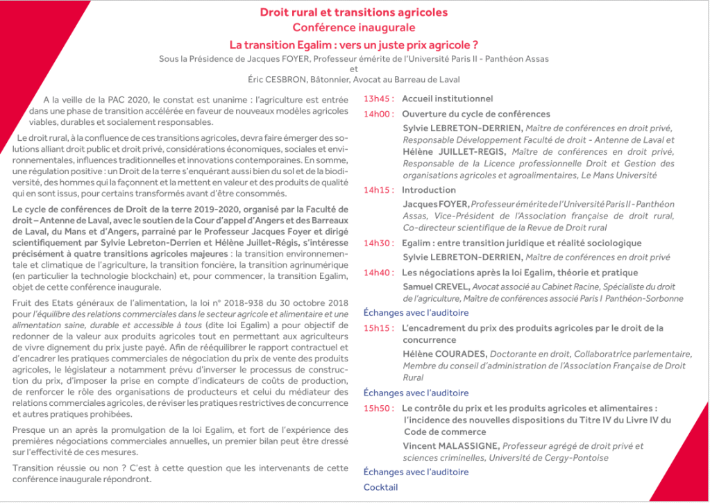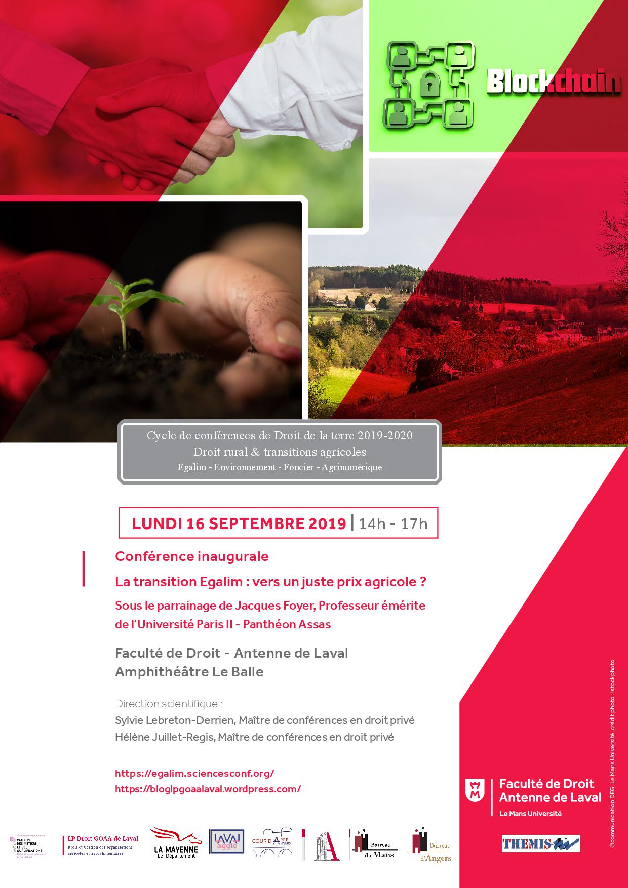 Le cycle de conférences de Droit de la terre 2019-2020 est organisé par le Themis-Um Laboratoire de recherches de l’Université du Mans et la Faculté de droit – Antenne de Laval, avec le soutien de la Cour d’appel d’Angers et des Barreaux du Mans, de Laval et d’Angers. Parrainé par le Professeur Jacques Foyer et dirigé scientifiquement par Sylvie Lebreton-Derrien et Hélène Juillet-Régis, ce cycle s’intéresse précisément à quatre transitions agricoles majeures : la transition Egalim (16 septembre 2019), la transition foncière (7 février 2020), la transition agrinumérique et en particulier la technologie blockchain( ) et la transition durable et environnementale, objet de cette 2ème conférence, qui se déroule au Mans, en partenariat avec l’Institut du Risque et de l’Assurance.