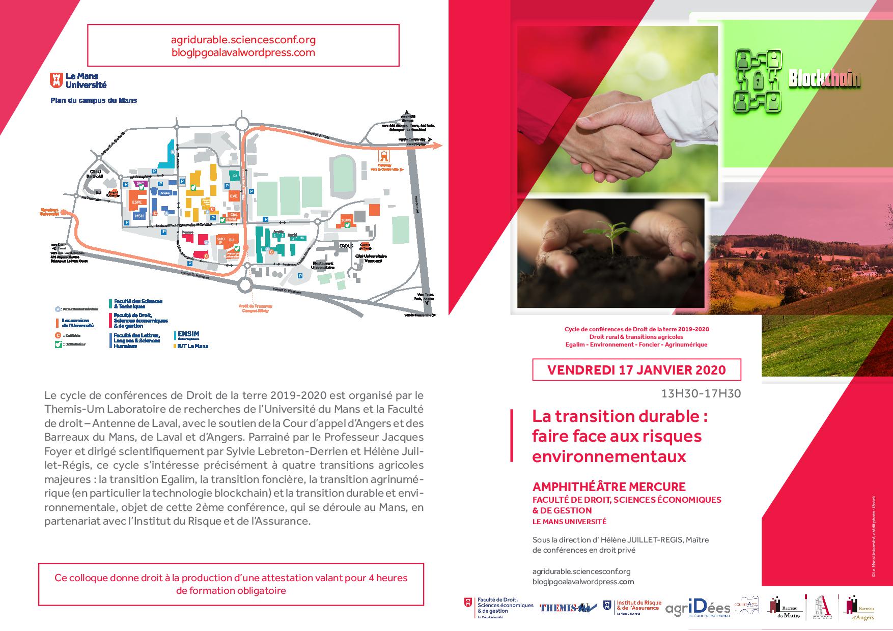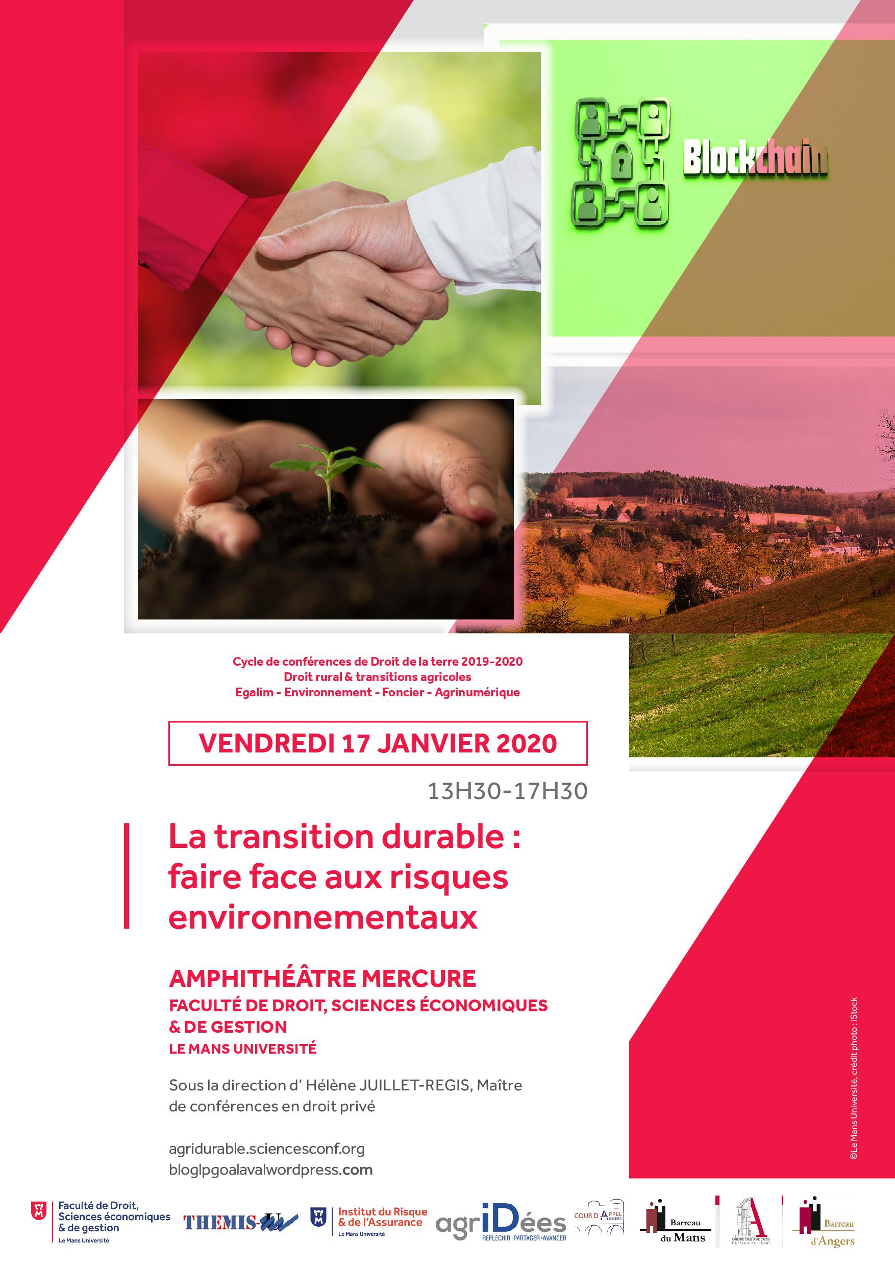 Le cycle de conférences de Droit de la terre 2019-2020 est organisé par le Themis-Um Laboratoire de recherches de l’Université du Mans et la Faculté de droit – Antenne de Laval, avec le soutien de la Cour d’appel d’Angers et des Barreaux du Mans, de Laval et d’Angers. Parrainé par le Professeur Jacques Foyer et dirigé scientifiquement par Sylvie Lebreton-Derrien et Hélène Juillet-Régis, ce cycle s’intéresse précisément à quatre transitions agricoles majeures : la transition Egalim (16 septembre 2019), la transition foncière (7 février 2020), la transition agrinumérique et en particulier la technologie blockchain( ) et la transition durable et environnementale, objet de cette 2ème conférence, qui se déroule au Mans, en partenariat avec l’Institut du Risque et de l’Assurance.