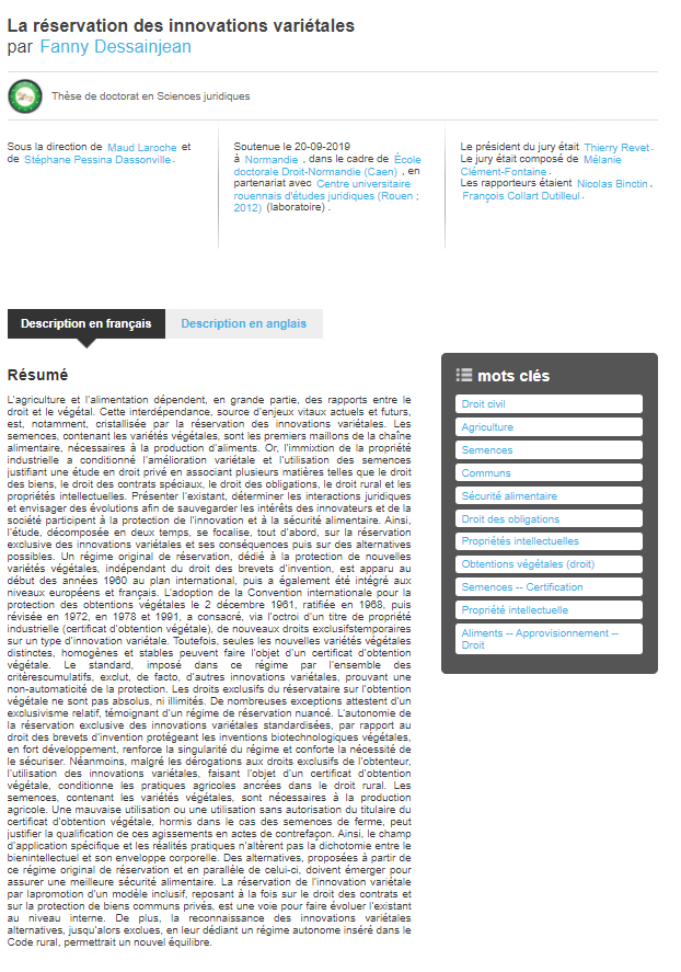 Fanny Dessainjean est docteur en Droit, auteur d’une thèse sur La réservation des innovations variétales, soutenue en septembre 2019.