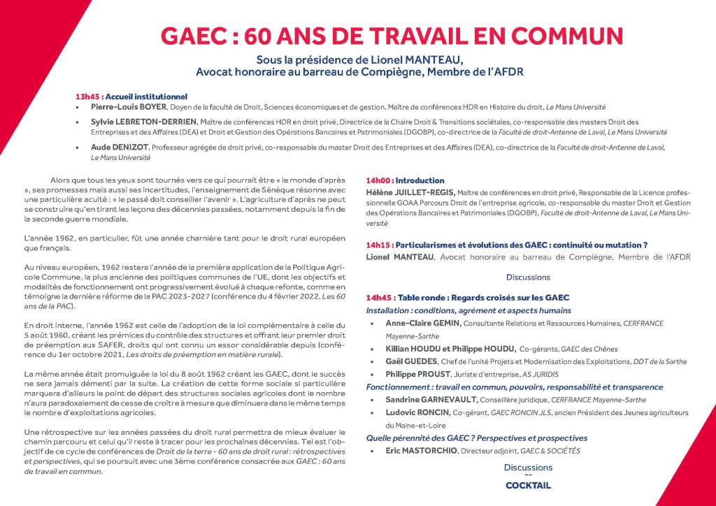 Les travaux, présidés par Me Lionel Manteau, permettront de revenir sur les spécificités, particularismes et atouts des GAEC, ainsi que les évolutions de leur cadre juridique depuis 60 ans.