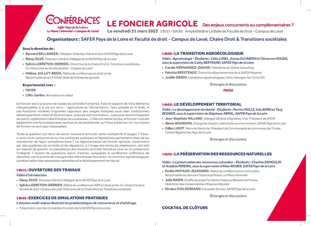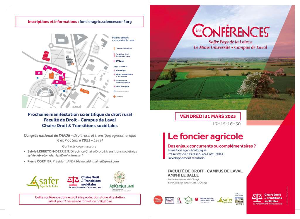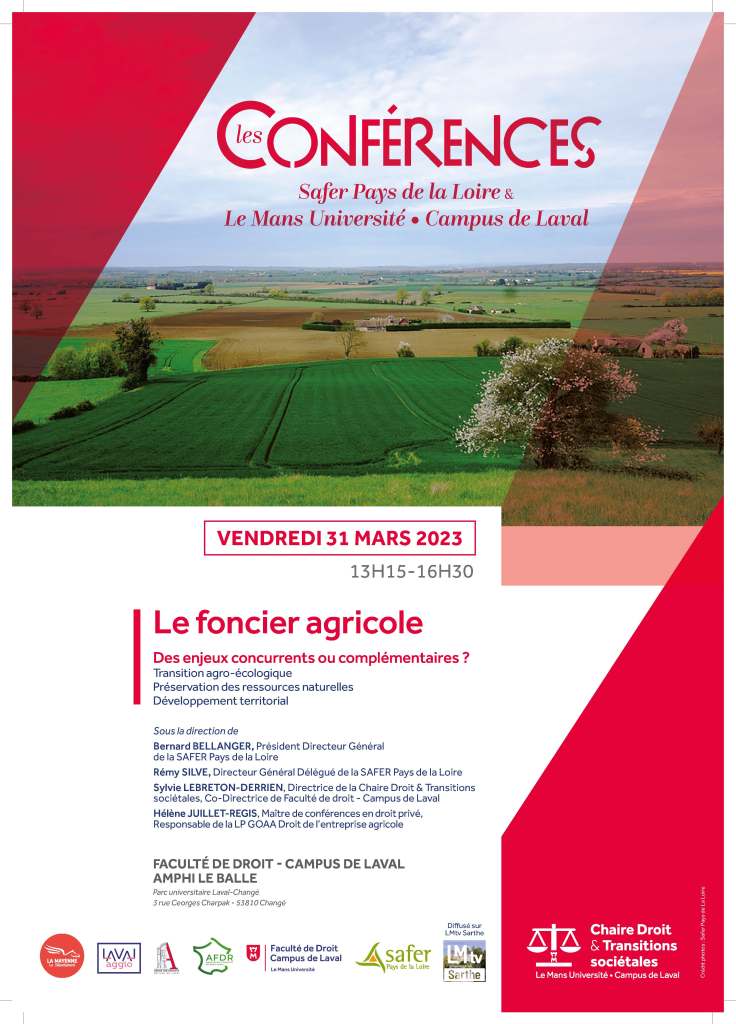 Le 31 mars 2023, la Faculté de droit – Campus de Laval et la Chaire Droit & Transitions sociétales, en partenariat avec la SAFER Pays de la Loire, accueilleront les travaux de la conférence